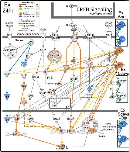 Figure 6. CREB signaling in the Xenopus laevis whole brain after exposure to 24 h of a predation threat from the larval salamander, Hynobius lichenatus. Changes in the memory and cognition pathways were predicted using the Ingenuity pathway analysis and compared to the controls (not exposed to predation) for the expressed genes in each treatment group. The degree of memory and cognition for Ex6hr (exposed to predation for 6 h), Ex10days (exposed to predation for 10 days), and Ex 5 days-Out (exposed to predation for 5 days, and then 5 days without), are shown in the right-hand side panels. |