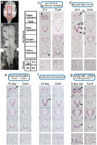 Figure 7. In situ-hybridization in the Xenopus lavies brain, using probes for selected genes. Xenopus laevis tadpoles sampled from Ex 6 hr (6 h exposure to predation), Ex 24 hr (24 h exposure to predations), Ex 10 days (10 days exposure to predation), and Ex 5 days-Out (5 days exposure to predation and then five days without) were used for in situ-hybridization using selected genes. (a) The red rectangle indicates the region of the brain used in this experiment. (b) Magnified image of the brain and the names of the brain regions. Tc, Dc, Ms, and Mt indicate the telencephalon, diencephalon, mesencephalon, and metencephalon, respectively. Antisense and sense probes were hybridized to the brain. In situ-hybridization results using anti-sense and sense probe for non-NMDA glutamate receptor (c), myosin light chain (d), hypoxia-inducible factor 1 alpha (e), erythropoietin receptor (f), and serpin 1 mRNA binding protein 1 (g). â corresponds to the mammalian isocortex; â¡ indicates a ventral region of the posterior commissure, which may correspond to the subcommissural organ; ⢠and ⣠indicate the thalamus and hypothalamus in the diencephalon, respectively. |