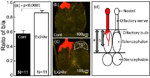 Figure 8. Extension of the axons in the brains of Xenopus laevis tadpoles exposed to the Japanese predatory larval salamanders, Hynobius lichenatus for 24 h. (a) Ratio of the extended axons per telencephalon compared with the control (Cont.; not exposed to Japanese predators) was calculated as b/a (a: length of telencephalon; b: length of the extended axons) in the brain. Statistical analysis (t-test) on the data were performed with SPSS. (b) Tadpoles not exposed to a predator (c) Tadpoles exposed to Japanese predator for 24 h. (d) Schematic profile of a tadpole’s brain stained by DiI. |