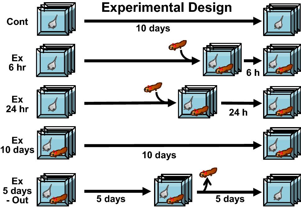 Figure 1. Experimental design for inducing predation in Xenopus tadpoles. Xenopus tadpoles were assigned to 5 different treatment groups. The control group (Cont) was not exposed to the salamander predator during the experiment (10 days). Tadpoles in the 6 h and 24 h groups were exposed to a salamander larva for 6 or 24 h before sampling, respectively. The 10-day group was exposed to a salamander larva for 10 full days, while the 5-days out group was exposed to a salamander larva for 5 days, to induce the predation threat, then the salamander was removed, and the tadpoles were kept for a further 5 days without the predation threat. |