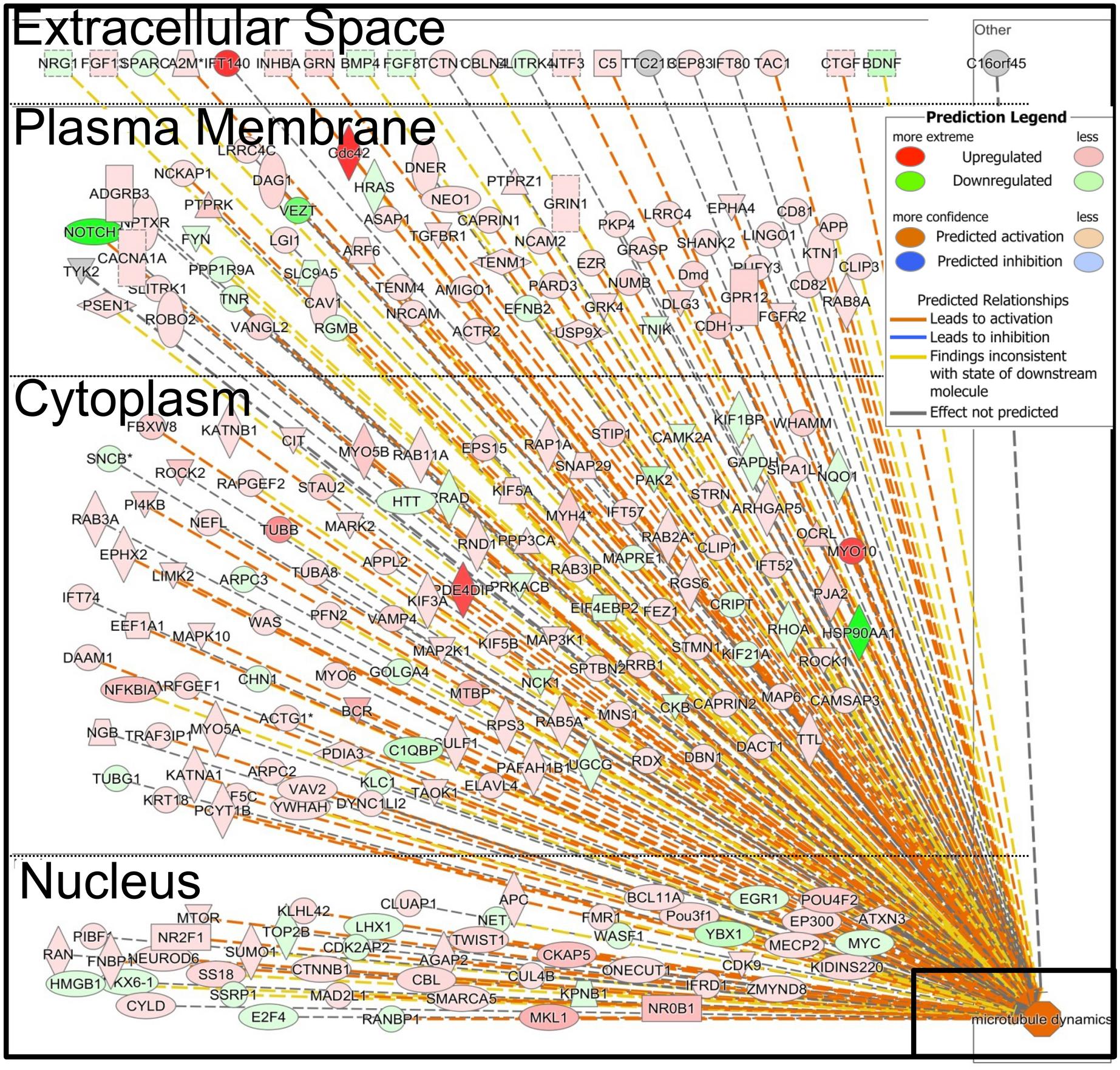 Figure 5. All genes involved in the microtubule dynamics in Xenopus laevis, as determined by RNA-seq after 24 h of exposure to a predation threat from the larval salamander Hynobius lichenatus (24 h group), in comparison to the control which was not exposed to a predation threat. The black rectangle indicates the microtubule dynamics. This figure was created using Ingenuity pathway analysis (IPA) version 2.1, QIAGEN; (https://www.qiagenbioinformatics.com/products/ingenuitypathway-analysis).