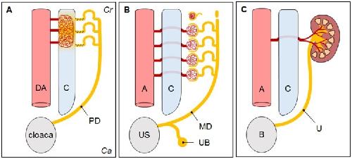 Fig. 2. Schematic drawings of pro-, meso-, and metanephros. A) Schematic drawing of the non-integrated nephron of a pronephros in frogs. The glomus, a single glomerular unit that is formed over two to three body segments and later becomes more compact, is supplied by arterial sprouts from the dorsal aorta and filters wastes directly in the fluid of the coelomic cavity (Gerth et al. 2005). The glomus is not integrated in the tubules but it lies in the immediate vicinity of them, so there is almost no space between the glomus and nephrostomes. These ciliated nephrostomes collect the coelomic fluid and the primitive urine will be collected through the pronephric tubules via the pronephric duct into the cloaca. See also Fig. 3A. B) Schematic drawing of the integrated nephrons of a mesonephros. The glomeruli are supplied by arterial sprouts from the aorta that pass behind the coelom and filter wastes into Bowman’s cavities. The glomeruli are therefore integrated in the tubules. The collected wastes are transported through the mesonephric tubules toward the mesonephric duct and collected in the urogenital sinus. See also Fig. 3B. The ureteric bud which initiates metanephric development and will become the ureter is an outgrowth of the mesonephric duct. The cranial-most metanephric nephrons degenerate over time. Note that these degenerated nephrons have often been wrongly described as pronephric. C) Schematic drawing of a metanephros and its supplying renal artery are situated retro-peritoneal, so dorsal of the coelom. The metanephric nephron with its Bowman’s space and extensive tubule is firmly embedded within the renal cortex and renal pyramids (lighter triangles). Urine is collected in the renal pelvis and transported through the ureter toward the bladder. A, aorta; B, bladder; C, coelom; Ca, caudal; Cr, cranial; DA, dorsal aorta; PD, pronephric duct; US, urogenital sinus; U, ureter; UB, ureteric bud; MD, mesonephric duct. |