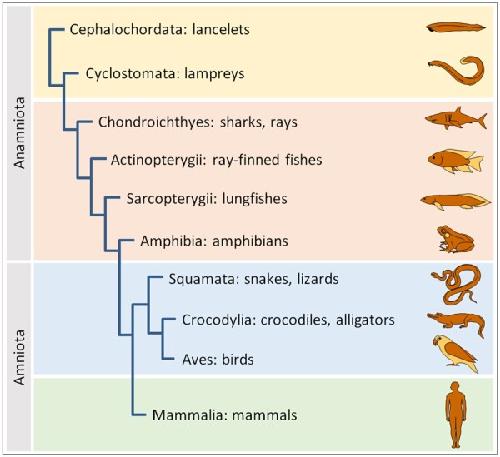Fig. 6. Overview of the appearance of a pronephros in animal species presented as evolutionary cladogram. For details and references, see Supplementary Table S1. (Cephalochordata and Cyclostomata): pronephros functioning as adult kidney. (Chondroichthyes, Actinopterygii, Sarcopterygii, and Amphibia): pronephros functioning in the larval stage. However, the pronephros seems to be absent in those Elasmobranchii that have no larval stage, and in the Amniota which develop within the body of the parent (Fraser 1950). (Squamata, Crocodylia, and Aves): Although a pronephros has been described in embryos of some of these animals (Supplementary Table S1), the term pronephros should be used with much restraint (Fraser 1950). Further research in these species is needed to clarify the contradictions that appeared in the literature as a result of the use of different definitions. (Mammals): no pronephros is present. |