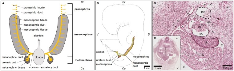 Fig. 1. Organization of kidney development. A) Diagram illustrating the three sets of excretory structures as supposed to be present in a human embryo during the fifth week (about 32 days, Carnegie stage 14) (after Moore 1988). Cr, cranial; Ca, caudal. B) Reconstruction of the urogenital system of a stage 16 human embryo specimen 6517 (37–42 days), including meso- and metanephros and their ducts (de Bakker et al. 2016). Cr, cranial; Ca, caudal; D, dorsal; V, ventral. C) Section through the mesonephric region of a stage 17 human embryo specimen 6521 (42–44 days). D, dorsal; V, ventral. D) Enlarged part of the section in C. A, arteriole; BC, Bowman’s capsule; C, coelom; D, mesonephric duct; G, gonad; GL, glomerulus; L, liver; MB, Malpighian body; PV, postcardinal vein; T, mesonephric tubules; V, vein. |