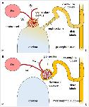 Fig. 3. Detailed architecture of a pronephric and a mesonephric nephron. A) Pronephric anatomy: the non-integrated nephron. A typical pronephric nephron, as can be found in amphibian larvae and some teleosts (Fraser 1950), consists of the following functional units; the coelom/nephrocoel with an external glomerulus or glomus, from which a ciliated nephrostome leads into the pronephric tubule that lastly drains into the pronephric duct (Fraser 1920, 1950; Dawson 1925; Lambert 1933; Davies 1950; Nieuwkoop and Faber 1994; Vize et al. 1997; Brandli 1999; Nishinakamura 2003; Raciti et al. 2008; Chimenti and Accordi 2011; Cho et al. 2011; Wessely and Tran 2011). The glomerulus or glomus is not integrated in the tubule. B) Mesonephric anatomy: the integrated nephron. The mesonephric tubules develop a Bowman’s capsule that encloses a vascularized internal glomerulus supplied by branches of the dorsal aorta (McCrory 1974). So the glomerulus is integrated in the mesonephric tubule. Bowman’s capsule, together with the internal glomerulus, constitutes a Malpighian body (Fraser 1950). The Malpighian body is regarded as a typical feature of the mesonephros (Wrobel and Suss 2000). The mesonephros differs from the pronephros by the absence of external glomeruli (Davies 1950, 1951; Nelson 1953; Hamilton et al. 1972; Vize et al. 1997; Wrobel and Suss 2000; Chimenti and Accordi 2011). The mesonephros is formed in all vertebrates, but while it degenerates and relinquishes its function to the metanephros in more advanced vertebrates, it serves as the adult kidney in fish and amphibians (Wessely and Tran 2011). DA, dorsal aorta; L, lateral; M, medial; VA, vas afferens; VE, vas efferens. |