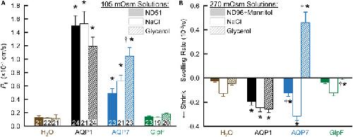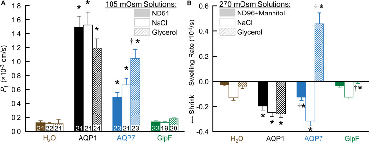 FIGURE 1. The dependence of Pf assays on solute composition in oocytes expressing AQPs. (A) Osmotic swelling assays. Here we lower osmolality to 105 mOsm by transferring oocytes to our ND51 solution, or HEPES-buffered solutions (pH 7.50) in which the only other solutes are NaCl or glycerol. (B) Osmotic shrinkage assays. After the oocytes in panel (A) are re-equilibrated at 195 mOsm overnight in OR3 media, we raise osmolality to 270 mOsm by transferring them to ND96 supplemented with mannitol, or to HEPES-buffered solutions (pH 7.50) in which the only other solutes are NaCl or glycerol. Bars represent mean ± S.E.M. The number of replicates are displayed at the base of each bar in panel (A), and are the same in panel (B). We harvested the oocytes from three frogs to perform these experiments. Statistics are performed as described in section “Materials and Methods.” The symbol “*” denotes a significant difference compared to the H2O control injected oocytes in the same buffer. The symbol “†” denotes a significant difference compared to both oocytes from the same cRNA injection type compared to NaCl buffer and compared to the H2O control injected oocytes in the same buffer. |