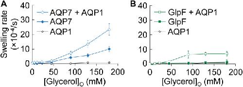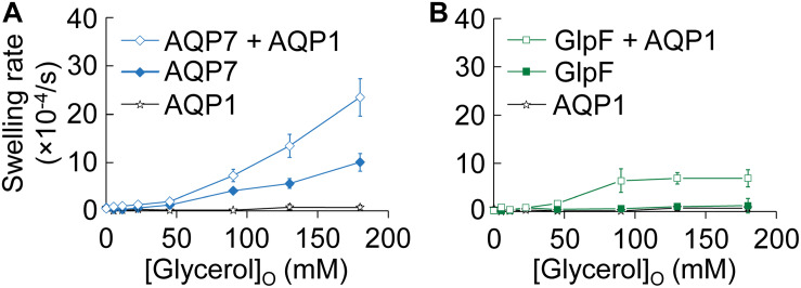 FIGURE 2. Normo-osmotic swelling of AQP7 and GlpF (± AQP1) expressing oocytes. (A) Oocyte swelling rates for WT AQP7 channels expressed alone or co-expressed with AQP1 as [glycerol]o increased in a normo-osmotic buffer. (B) Oocyte swelling rates for WT GlpF expressed alone or co-expressed with AQP1 as [glycerol]o in increased in a normo-osmotic buffer. All data points represent mean ± S. E. M. These data and the number of oocytes and oocyte preparations/cRNA injections used to generate each point are detailed in Supplementary Tables S1âS3. |