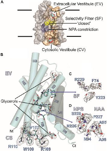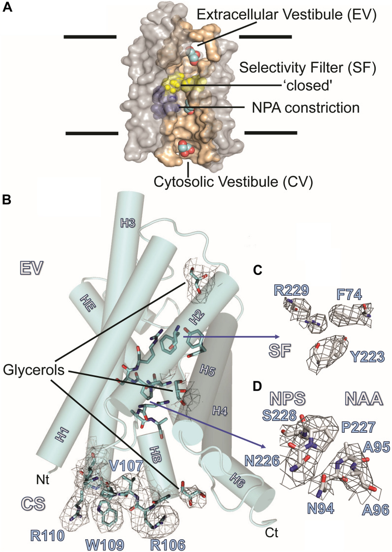 FIGURE 3. AQP7 Structure. (A) Van-der-Waals surface representation of the AQP7 glycerol/water channel comprising the extracellular vestibule, the closed selectivity-filter (SF, shaded yellow), the NPA constriction (shaded purple) and the cytosolic vestibule. The view into the channel has been generated by omitting half of the protein. Channel lining residues are shaded peach. (B) Side view of one of the four AQP7 monomers, showing glycerol channel occupancy and detailed views of the NPA (NAA/NPS arrangement) and SF region. Due to the high symmetry (F4132) and the presence of non-crystallographic symmetry, side-chain electron density features are resolved at near atomic detail. Selected 2Fo-Fc maps highlight details of resolved large side chains for (i) the cytosolic loop B residues R106, V107, W109 and R110 and (ii) three glycerol molecules bound in the monomeric pore. (C) 2Fo-Fc map highlighting details of the SF region residues F74, Y223, and R229. Because residue G222 does not participate in the SF, it is not shown for clarity. (D) 2Fo-Fc map highlighting details of the NPA region residues N226, P227, S228, N94, A95, and A96. At early stages of refinement and model building, when we were employing 4-fold symmetry-averaged maps, we were able to observe a clear density, consistent with glycerol at the NPA of all 4 monomers. Thus, a glycerol is present at the NPA, albeit at low occupancy. In contrast to GlpF, no ligand electron density is observed at the SF. Two of the four monomers (including the one shown here) contain an additional glycerol molecule bound at the cytoplasmic surface (CS) region of the monomeric channel. Loop B and glycerols in panel B are contoured at 1.5 Ï, SF residues in panel C are contoured at 2 Ï, and NPA residues in panel (D) are contoured at 1.5 Ï. |