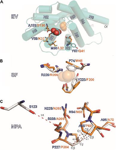 FIGURE 4. Structures of the EV, SF and NPA regions. (A) Location EV: View of the monomeric extracellular channel entrance of AQP7 (cyan) with a lateral shift (5.5 à ) in the position of the resolved glycerol [center: AQP7 (red-cyan), shifted right: GlpF (orange)]. We depict the narrowing of the entrance by overlaying the protruding residues of GlpF (D130, K33, L32 and Q41) and AQP7 (A153, V59, M58, and Y67). Note the inward and outward facing conformations of Y67. (B) Location SF: Overlay of Selectivity filter (SF) region for AQP7 and GlpF formed by two aromatic residues (Y223, F74 in AQP7), positioned at a right angle to each other, forming a hydrophobic wedge opposite from R229 and G222. G222 points away from the SF, and does not participate in the restriction. We therefore omit G222 from the figure for clarity. The glycerol molecule (transparent orange spheres) shown at this location is only present in the GlpF SF; the AQP7 SF is unoccupied. A glycerol molecule (orange spheres) at this location is present only in GlpF. (C) Details of the van der Waals packing arrangement of the NAA-NPS motifs involving a slight out of plane rotation of the NPS motif. The glycerol molecule at this location is not displayed in this panel for clarity and because of partial disorder and low occupancy, as documented in the PDB submission. A polar contact is observed between S228 and S123 of Helix 2. The distance unit of the annotated dashed lines is à . |