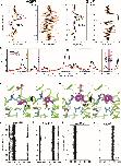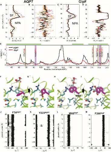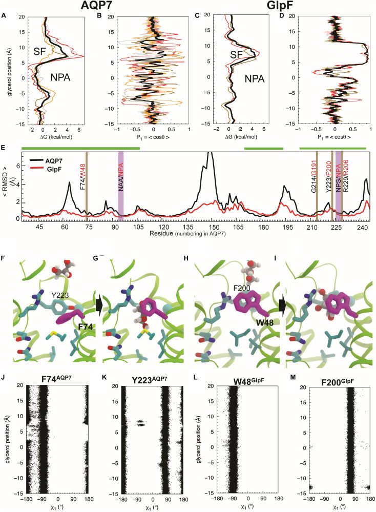 FIGURE 5. Glycerol translocation along through AQP7 and GlpF. (A) Free energy (ÎG) profiles of glycerol partitioning along the pores of AQP7 calculated from the umbrella sampling simulations. (B) Orientation (P1) profiles of the molecule along the AQP7 (i.e., P1 fluctuates between +1 and â¼ â1 and θ from â¼0° to â¼180°). (C,D) ÎG and P1 profiles of glycerol partitioning in GlpF. The profiles along the individual pores are shown as individually colored thin lines. θ is the angle between the vector connecting the first and last carbon atoms of the glycerol molecule and the membrane normal (approximately the pore axis). P1 is ⼠± 1 when the orientation of the molecule is parallel to the pore axis, and <P1> is â¼0 when it is isotropic. (E) Overall conformational dynamics of AQP7 versus GlpF characterized by time-averaged RMSD profiles calculated over all monomeric channels and over all 3 flooding simulations for each protein. The NPA and SF regions are highlighted in vertical purple and brown bars, respectively. Residues of helical regions involved in glycerol permeation are highlighted in horizontal green bars. (FâI) MD snapshots depicting glycerol transition through the SF region. The SF is centered at z = â¼ 7.5 à . F74 of AQP7 (purple) changes its conformations as the molecule transits between the extracellular vestibule and the NPA region. It is equivalent to W48 in GlpF. Also, Y223 of AQP7 is replaced by a phenylalanine (F200) in GlpF. (JâM) Conformations of the SF residues (F74 and Y223 of AQP7, and W48 and F200 of GlpF) as function of glycerol moleculeâs position calculated from the umbrella sampling simulation, characterized by their N-Cα-Cβ-Cγ (Ï1) dihedral angles. |