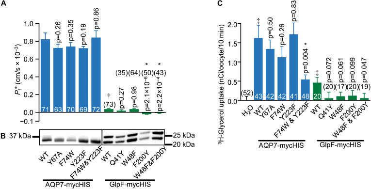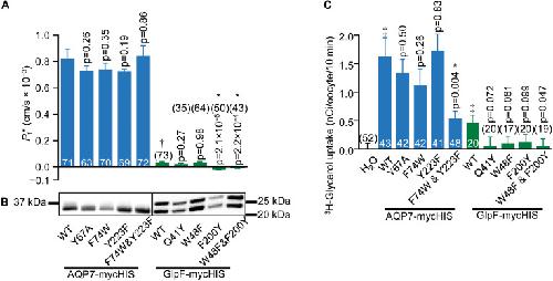 FIGURE 6. Water and glycerol permeabilities of AQP7 and GlpF. (A) Channel-dependent osmotic water permeability (Pf*) for AQP7 and GlpF constructs. Pf* for positive control AQP1 oocytes is 2.01 ± 0.10 à 10â3 cm/s (n = 81). We harvested oocytes from three frogs to perform these experiments. (B) AQP7 or GlpF in the surface fraction from biotinylated oocytes detected by western blot using a c-myc primary antibody. The predicted molecular weights of full-length myc-HIS tagged AQP7 and GlpF constructs are 39.8 and 32.4 kDa, respectively. AQP7 construct bands actually run in the 10% Bis-Tris gels at â¼32.5 kDa. GlpF constructs run as a doublet of 25 and 22 kDa. These smaller than expected bands reflect differing degrees of N-terminal truncation because the epitope for the primary antibody is at the C-termini of all constructs. Protein bands are aligned with the corresponding Pf* bar in panel (A). AQP7 and GlpF samples are analyzed on separate blots denoted by a frame around each blot image. Displayed to the side of each blot are the molecular weight markers (Other example blots are in Supplementary Figure S8). (C) 10-min 3H-glycerol uptakes for AQP7 and GlpF constructs in an ND96 solution with 90 mM total [glycerol]0 replacing 45 mM NaCl. For both panels (A,C), bars represent mean ± S.E.M. and the number of replicates is at the base of each bar, or in parentheses above the bar. â denotes Pf* for GlpF WT, which is much smaller than AQP7 WT. â¡ in panel C denotes that uptake for both AQP7 WT and GlpF WT are significantly above the H2O control (p = 3.25 à 10â5, and p = 0.014, respectively). Each p-value reflects comparisons of mutant to its respective WT. The symbol â*â denotes statistical significance. For statistical analyses, see section âMaterials and Methods.â We harvested oocytes from two frogs to perform these experiments. |