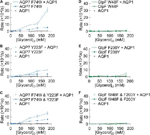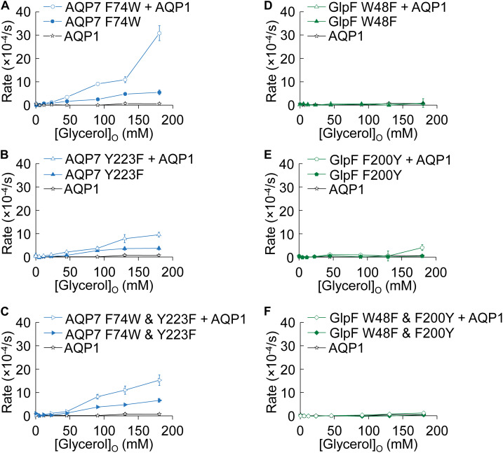 FIGURE 7. Normo-osmotic swelling of AQP7 and GlpF (± AQP1) expressing oocytes. (AâC) Oocyte swelling rates for AQP7 mutant channels expressed alone or co-expressed with AQP1 as [glycerol]o in increased in a normo-osmotic buffer. (DâF) Oocyte swelling rates for GlpF mutant channels expressed alone or co-expressed with AQP1 as [glycerol]o in increased in a normo-osmotic buffer. All data points represent mean ± S. E. M. These data and the number of oocytes and oocyte preparations/cRNA injections used to generate each point are detailed in Supplementary Tables S3, S4. |