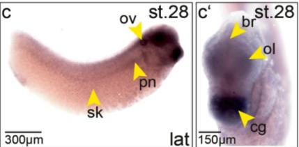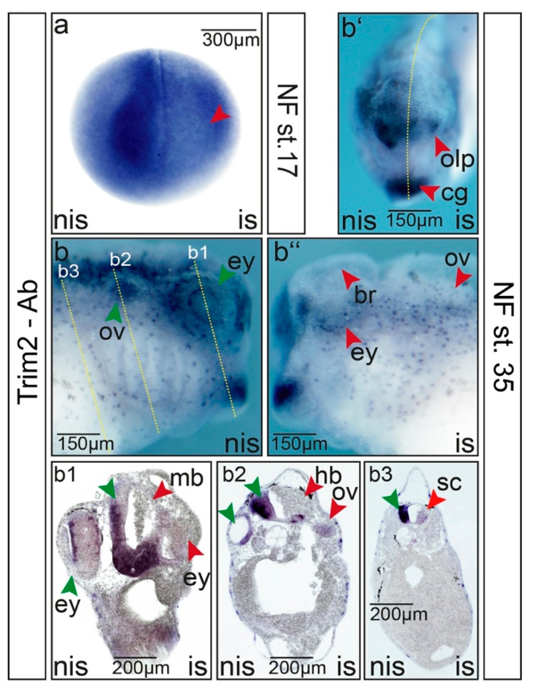 Figure 3. Suppression of trim2 function interferes with embryonic central nervous system (CNS) development. Microinjections of trim2-morpholino were performed into one cell of a two-cell stage embryo. trim2-morphants were analyzed by whole-mount immunochemistry using a commercial Trim2 antibody at (a) NF stage 17 and (b) NF stage 35. (b) Non-injected side (nis), (bâ) anterior view, (bââ) injected side (is). Forming brain (br), cement gland (cg), eye (ey), olfactory pit (olp), and otic vesicle (ov) showed loss of Trim2 expression. (b1âb3) Twenty-micrometer gelatine/albumin transverse sections of the cranial region. The embryonic brain appeared smaller and disorganized upon trim2-morpholino injection. Midbrain (mb), eye (ey), hindbrain (hb), cement gland (cg), otic vesicle, and spinal cord (sc). Red arrowheads represent the affected region of the injected side. Green arrowheads indicate complementary regions of the control side (nis). Scales as indicated. |