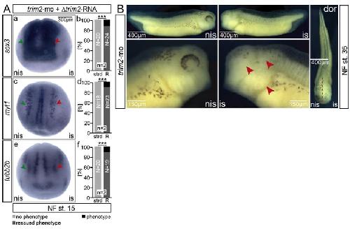 Figure S3. (A) Phenotypic rescue of trim2 morpholino-injected embryos. Synthetic Xenopus trim2 RNA (Îtrim-2), which did not contain a complementary sequence of the morpholino, was injected along with trim2 morpholino into one cell of a two-cell stage embryo. (a) The expanded expression of sox3, (c, e) and the medial, intermediate, and longitudinal stripes of myt1 and tubb2b-expressing cells were rescued on the injected side. Red arrows indicate the rescued side. (b, d, f) The percentage of embryos rescued (sox3 strd-mo n = 20 embryos, trim2-mo n = 24 embryos, p = *** 7.21E-09; myt1 strd-mo n = 18 embryos; trim2-mo n = 23 embryos; p = 6.46E-09; tubb2b strd-mo n = 20 embryos; trim2-mo n = 19 embryos; p = 1.78E-08, unpaired Ï2 test). Scale as indicated. (B) Phenotype of trim2 morphants. (A) Upper panel, whole embryo, lateral views, non-injected side (nis) and injected side (is). Bottom panel shows enlarged cranial lateral view. Red arrowhead indicates a suppression of proper head development (eye, otic vesicle, and branchial arches) and pigmentation. The bar plot represents the survival percentage of trim2 morphants compared to non-injected control and standard morpholino-injected embryos. Survival rate was 24% for trim2 morphants. Total injected (ctrl n = 186 embryos, strd-mo n = 288 embryos, trim2-mo n = 254). Survived (ctrl n = 177 embryos, strd-mo n = 253 embryos, trim2-mo n = 62). Scales as indicated. |