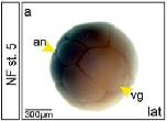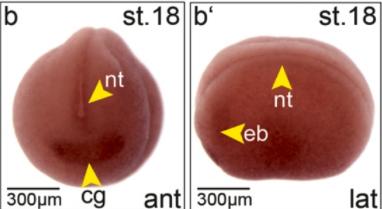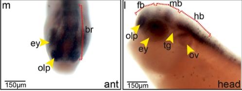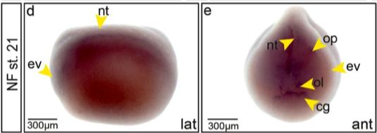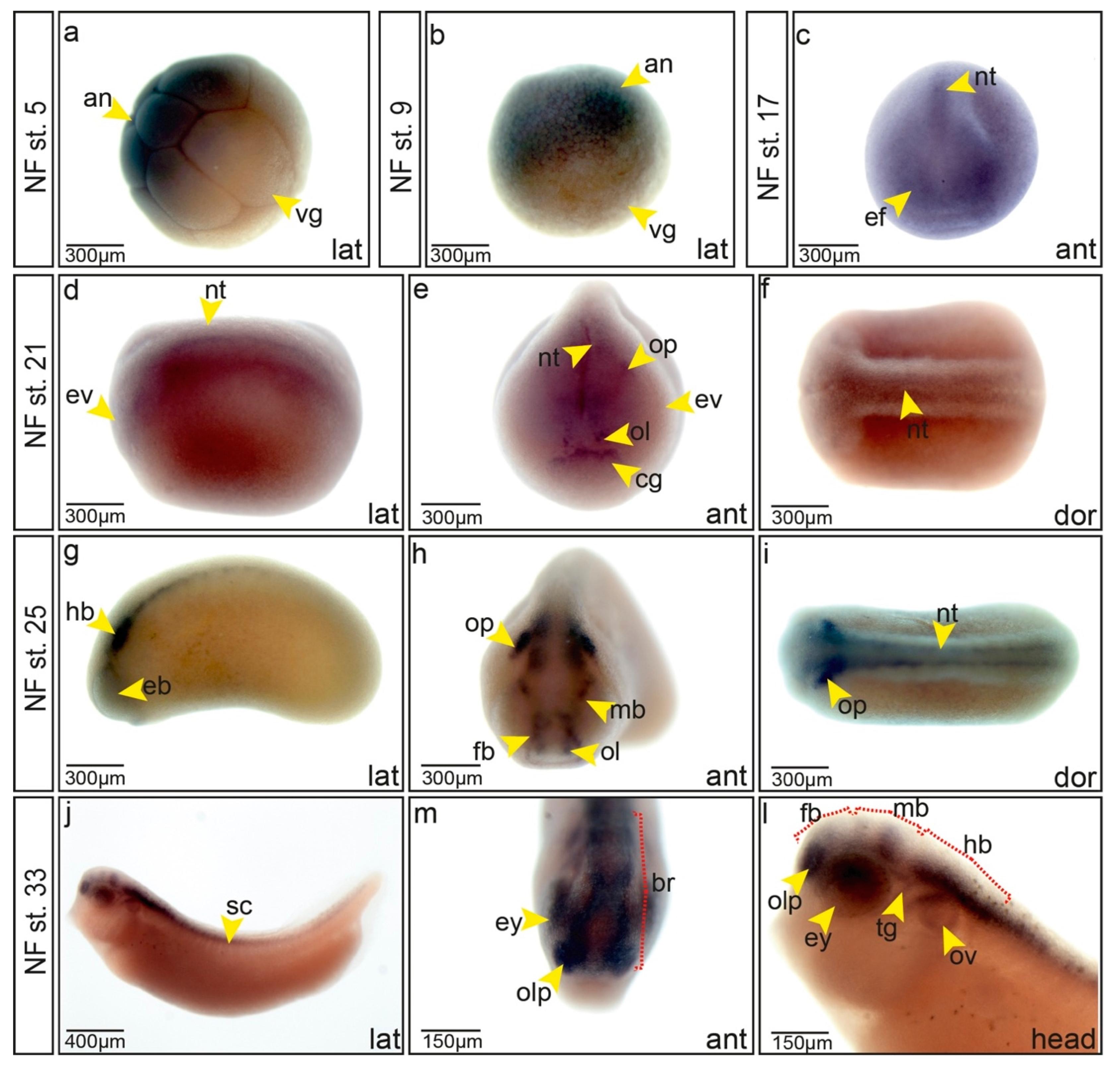 Figure 1. Expression of trim2 during neurogenesis. (aâi) trim2 expression was assessed by whole-mount in situ hybridization (Wmish) at different developmental stages. (a,b) Maternal trim2 transcripts were detected in the animal (an) opposed to the vegetal (vg) hemisphere of Xenopus embryos. (c) NF stage 17, anterior view, trim2 transcripts were evident in the eye field (ef) and in the forming neural tube (nt). (dâf) NF stage 21, lateral, anterior and dorsal views. trim2 transcripts were detected in eye vesicle (ev), neural tube (nt), olfactory (ol), and otic placode (op), as well as cement gland anlage (cg). (gâi) At NF stage 25, trim2 expression became more distinct in eye vesicle (eb), forebrain (fb), midbrain (mb), olfactory placode (ol), otic placode (op), and neural tube (nt). (jâl) NF stage 33, trim2 in fore- (fb), mid- (mb), and hindbrain (hb), eye (ey), olfactory pit (olp), otic vesicle (ov), spinal cord (sc), and trigeminal ganglion (tg). Scales as indicated. (strd-mo n = 20 embryos; trim2-mo n = 16 embryos (E); p = 1.97E-09, unpaired Ï2 test, Ï2 = 36, df =1, phenotype occurrence (po) =16, p < 0.001). |