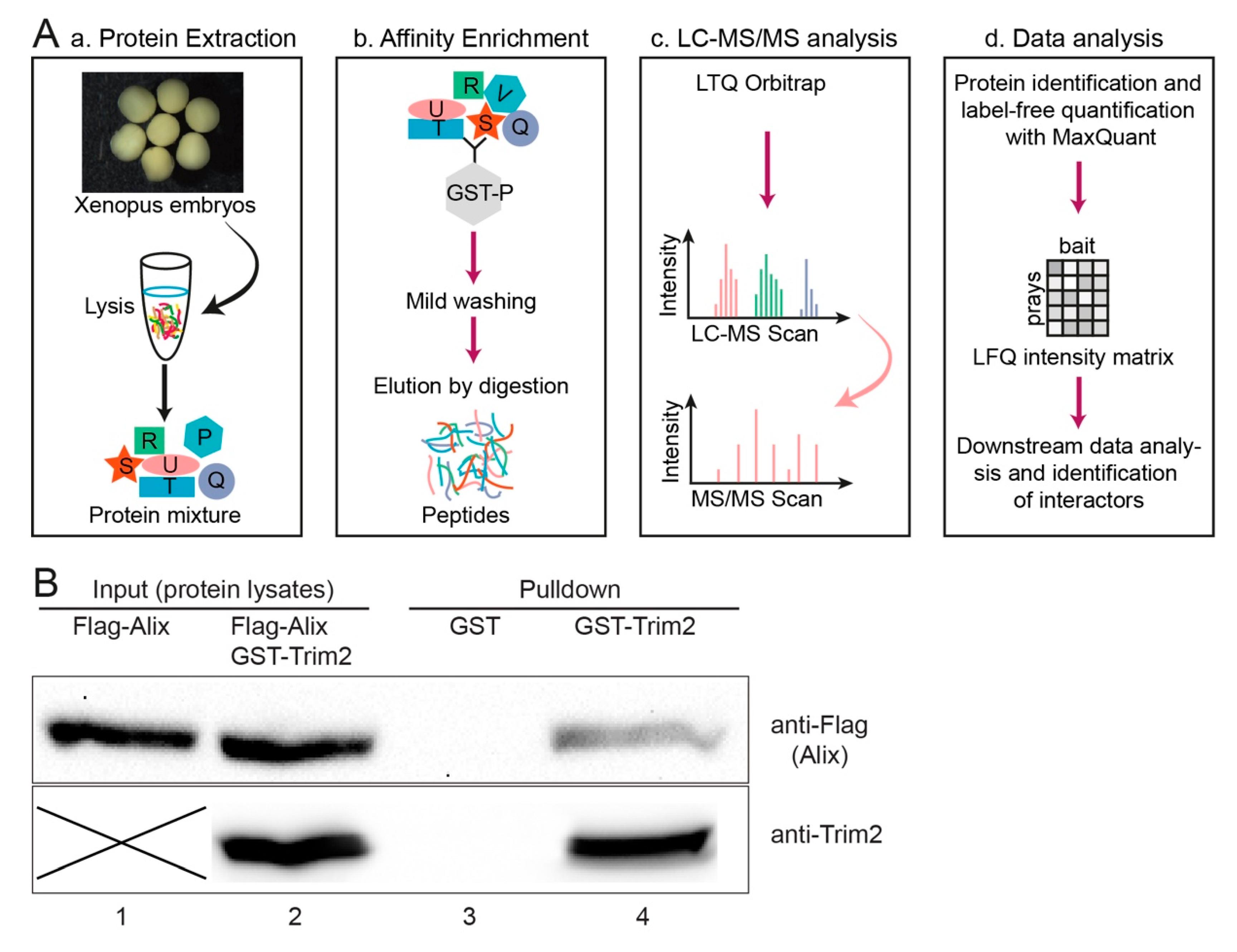 Figure 5. (A) Schematic representation of LC-MS/MS analysis for identification of interaction partners, modified after [31]. (a) Protein lysates were extracted from NF stage 30-36 embryos using mild non-denaturing conditions, (b) GST tagged bait protein and protein interactors from the embryo lysates were enriched by GSH-Sepharose. Subsequently, bound proteins were digested into peptides. (c) The peptide mixture was analyzed by single-shot liquid chromatography tandem mass spectrometry (LC-MS/MS) on an Orbitrap instrument (see acknowledgement). (d) Raw data were processed with MaxQuant to identify and quantify proteins and to identify interacting proteins. (B) Interaction of Trim2 and Alix was verified by GST pulldown assay using GST-Trim2 as bait and lysates of HEK293T cells transfected with Flag-Alix by Western blot. Cell lysates with input proteins (Lanes 1 and 2). GST alone serves as a control (Lane 3). Eluted flag-tagged Alix after binding GST-Trim2 (Lane 4, upper blot). Note: images of the blots are cropped accordingly to the area of exposed protein bands. Uncropped blots in Figure S4. Two different gels/bolts were used to show the eluted flag-tagged Alix and precipitated GST-Trim2 of the same sample. |