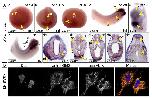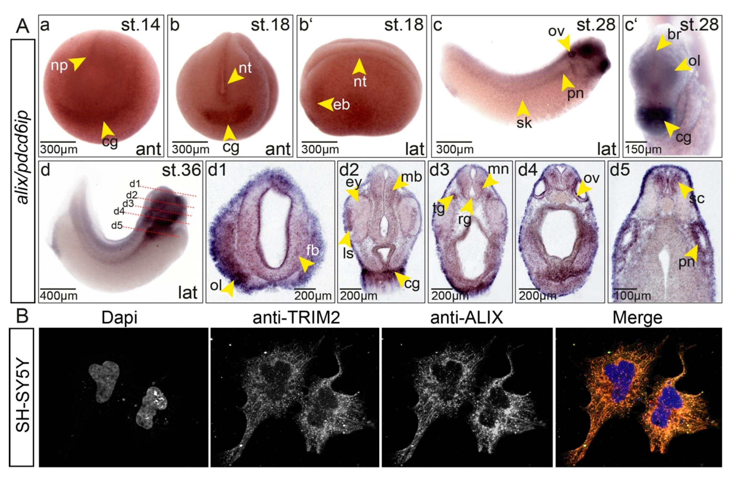Figure 6. (A) Expression of alix during neurogenesis overlaps strongly with trim2 in Xenopus. (a) At NF stage 14, alix expression was observed within the neural plate (np) and cement gland Anlage (cg). (bâbâ, anterior (ant) and lateral (lat) views) At NF stage 18, alix transcripts were detected in the neural tube (nt), eye vesicle (ev), and forming cement gland (cg). (câcâ) At NF stage 28, the presumptive brain (br), olfactory placode (ol), otic vesicle (ov), cement gland (cg), pronephros (pn), and skin cells (sk) reveal alix transcripts. (d) At NF stage 36, a lateral view showed strong expression in eye, embryonic brain, spinal cord (sc), otic vesicle, and pronephros. (d1âd5) Twenty-micrometer transverse gelatine/albumin sections taken at the level of fore-, mid-, hindbrain, otic vesicle, and spinal cord. Transcripts of alix were detected in the eye (ey), forebrain (fb), midbrain (mb), hindbrain, lens epithelium (ls), motor neuron (mn), olfactory pit (olp), otic vesicles (ov), radial glial cells (rg), spinal cord (sc), and trigeminal nerve (tg). (B) Endogenous Alix and Trim2 were detected by fluorescence immunohistochemistry in a strongly overlapping pattern within the cytoplasm of SH-SY5Y glioblastoma cells. Pictures were taken in gray-scale. Merge in false colors. Nuclei were stained with DAPI (blue). |