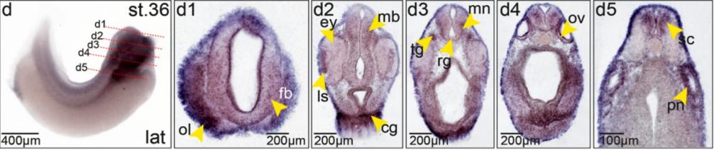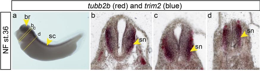 Figure S2. Whole-mount double in situ hybridization of trim2 and tubb2b at NF stage 35/36. (a) Lateral view. (bâd) Transverse section of midbrain, hindbrain, and the spinal cord region. trim2 is mainly expressed in differentiated neurons (e.g., motor neurons, dark blue) such as tubb2b (red). |