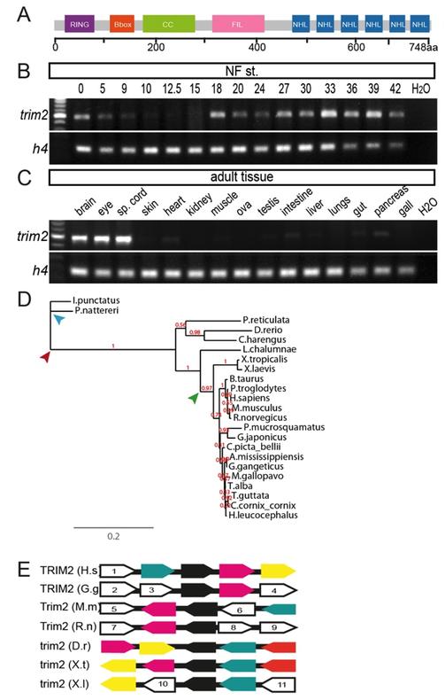Figure S1. (A) Xenopus Trim2 protein consists of 748 amino acids and is organized in domains containing a single RING zinc finger, two B-box zinc fingers, a single coiled-coiled, Filamin/ABP 280 domain, and six NHL repeats. (B) Semi-quantitative RT-PCR analysis on consecutive developmental stages. Maternal expression of trim2 is observed followed by gradual decrease in expression by gastrulation (NF stage 10) and increasing again. Strong expression at neurulation (NF stage 18) until the latest stages analyzed (NF stage 42) in a gradually increasing manner. Expression of histone H4 was monitored to control total RNA input. (C) Semi-quantitative RT-PCR analysis of trim2 expression in adult tissues. The brain, eye, and spinal cord showed strong expression, while the skin, heart, kidney, muscle, testis, intestine, and pancreas showed weak expression of trim2. (D) Phylogenetic analysis: An evolutionary rooted tree is constructed based on maximum likelihood and bootstrap analysis. The branch length is proportional to the number of substitutions per site. The numbers in red next to nodes represent bootstrap support values. The red arrow indicates the root of the tree, the blue arrow indicates the out-group, and the green arrow indicates the common ancestral node between mammals and amphibians. The bar at the bottom of the phylogram indicates the evolutionary distance to which the branch lengths are scaled based on the estimated divergence. There is a relatively very little divergence observed over time. (E) Synteny organization of Trim2/trim2: The chromosomal localization of the gene encoding trim2 is conserved in mammals. In vertebrates, the locus appeared grossly conserved. Each arrow stands for a single gene. The arrowhead indicates the direction of the ORF. Orthologues are marked with identical colors. trim2 (black arrow) is present in all species analyzed. Upstream trim2 is flanked by the same gene with minor exceptions. Downstream trim2 is flanked by the same gene, except for mammalian. Arrow colors; black: trim2, red: meiotic nuclear divisions 1/mnd1, yellow: transmembrane 131 like/tmem131l, turquoise: FH2 domain containing 1/fhdc1, orange: ADP ribosylation factor interacting protein 1/arfip1, white 1-10: yet uncharacterized proteins. NOT shown: multispecies alignment- due to poor resolution - see Cells article /website for alignment. (F) Comparison of amino acid sequences of TRIM2/Trim2. H. sapiens (GenBank Accession no. NP_001123539), B. taurus (GenBank Accession no. NP_001077204), M. musculus (GenBank Accession no. NP_109631), R. norvegicus (GenBank Accession no. NP_001102022), G. gallus (GenBank Accession no. NP_001244243), D. rerio (GenBank Accession no. NP_001014393), X. tropicalis (GenBank Accession no. NP_001005680), X. laevis (GenBank Accession no. NP_001085492). Conserved domains are indicated by colored boxes according to A. |