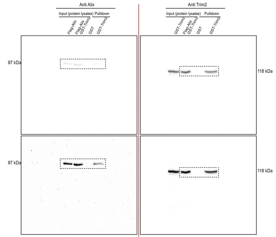 Figure S4. (A) Uncropped blots of the GST pulldown assay (Figure 5B) at different exposure times. Blot left of red line probed against Alix and the right side against Trim2. The rectangles with dashed lines indicate the presented detail in Figure 5B. The GST-Trim2 lane was loaded as a positive control for the ab reaction only. |