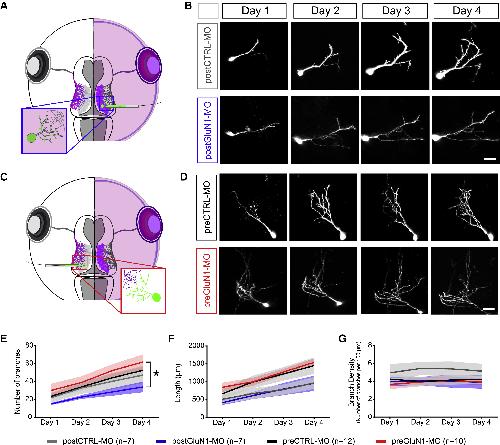 (A) Electroporation of EGFP into the non-MO side of the tadpole to label single axons in the postCTRL-MO or postGluN1-MO conditions.