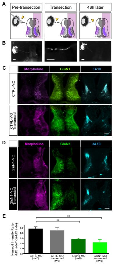 (D) Examples of confocal immunofluorescent sections of hemimorphant midbrains. First column: MO-lissamine fluorescence (magenta); second column: GluN1 immunofluorescence (green); third column: merged image. Scale bar, 100 μm.