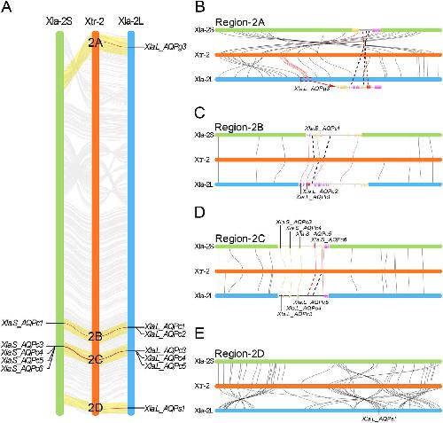 ig. 3 Deletion of AQP genes in the second pair chromosomes in X. laevis. a Synteny analysis of the second chromosomes in the homeologs in X. laevis and X. tropicalis genome. The regions encoding AQP genes were shadowed in light yellow. The linkages between AQP genes were marked with red line. AQP gene names in Xla genome were marked beside the second chromosomes. b Synteny analysis of region-2A encoding AQPg3 ortholog. c Synteny analysis of region-2B encoding AQPc1 and AQPc2 orthologs. d Synteny analysis of region-2C encoding AQPc3 to AQPc6 orthologs. e Synteny analysis of region-2D encoding AQPs1 ortholog. In this figure, red curves represent the linked genes were appeared in both Xtr and the corresponding homeologs in Xla. Red dashed lines represent the genes that appeared in Xtr genome but absented in Xla genome |