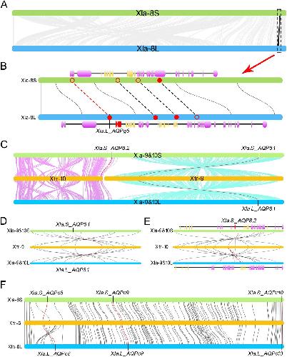 Fig. 4 Synteny analysis of the AQP orthologs in Xenopus species. a Synteny analysis of the eighth pair chromosomes in the homeologs in X. laevis. b Synteny analysis of the region encoding AQPg5 ortholog. c Synteny analysis of the ninth pair chromosomes in the homeologs in X. laevis and the ninth and tenth chromosomes in X. tropicalis genome. d Synteny analysis of the region encoding AQP8.1 ortholog. e Synteny analysis of the region encoding AQP8.2 ortholog. f Synteny analysis of the region encoding AQPc8 to AQPc10 orthologs. In this figure, red curves represent the linked genes were appeared in both Xtr and the corresponding homeologs in Xla. Red dashed lines represent the genes that appeared in Xtr genome but absented in Xla genome