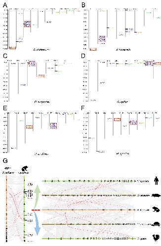 Synteny analyses of the corresponding region in the genome of Xla and Xtr. (A) Collinearity analysis of the region in the end terminal of the second chromosome in Xla and some scaffolds in Xtr. (B) Collinearity analysis of the region in the end terminal of the eighth chromosome in Xla and some scaffolds in Xtr. (C) Collinearity analysis between the ninth pair chromosomes in Xla genome. Part A represent the region corresponding to the tenth chromosome in Xtr genome. Part B represent the region corresponding with the ninth chromosome in Xtr genome. Fusion region represent the genes in this region were not detected in both the ninth and tenth chromosomes in Xtr genome. (D) Collinearity analysis of the fusion region in Xla genome and some scaffolds in Xtr genome. |