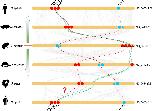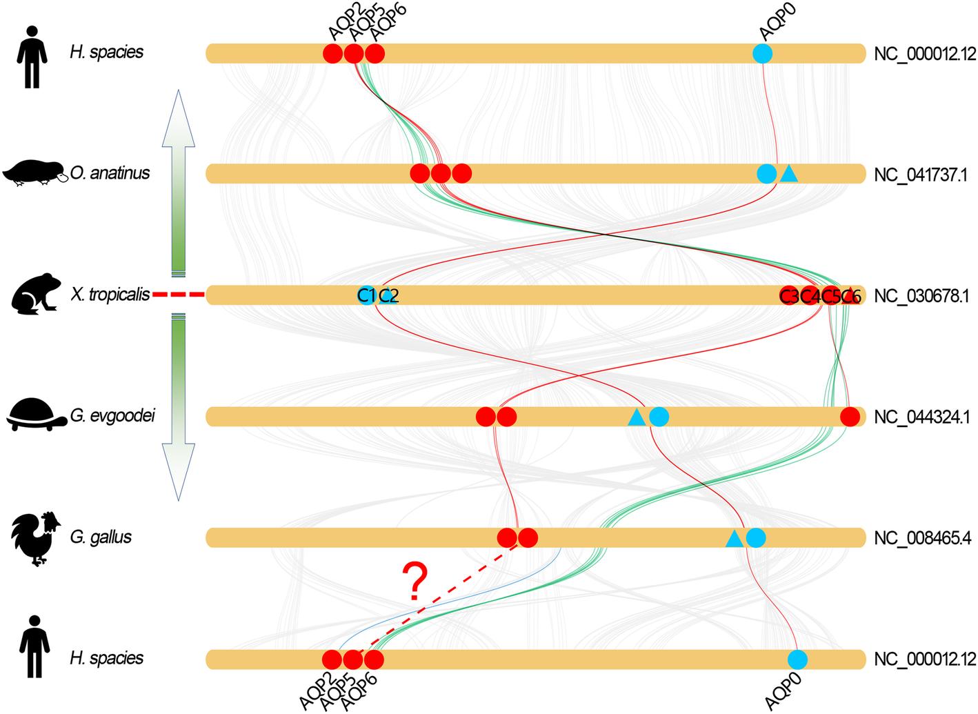 Fig 5. Collinearity relationship between the orthologs from AQPc1 to -c6 in different species. The round-corner rectangles filled in yellow represent the conserved regions of the chromosomes in different species. The words behind the round-corner rectangles represent the number of chromosomes. The circles filled in blue represent the conserved Mip protein. The triangles filled in blue represent the abnormal C-AQPs that neighbor localized beside Mip. The circles filled in red represent the orthologs of AQPc3 to -c5. The triangle filled in red represent the orthologs of AQPc6. The red curves represent the linkages between AQP orthologs. The green curves represent the linkages of the inverted region |