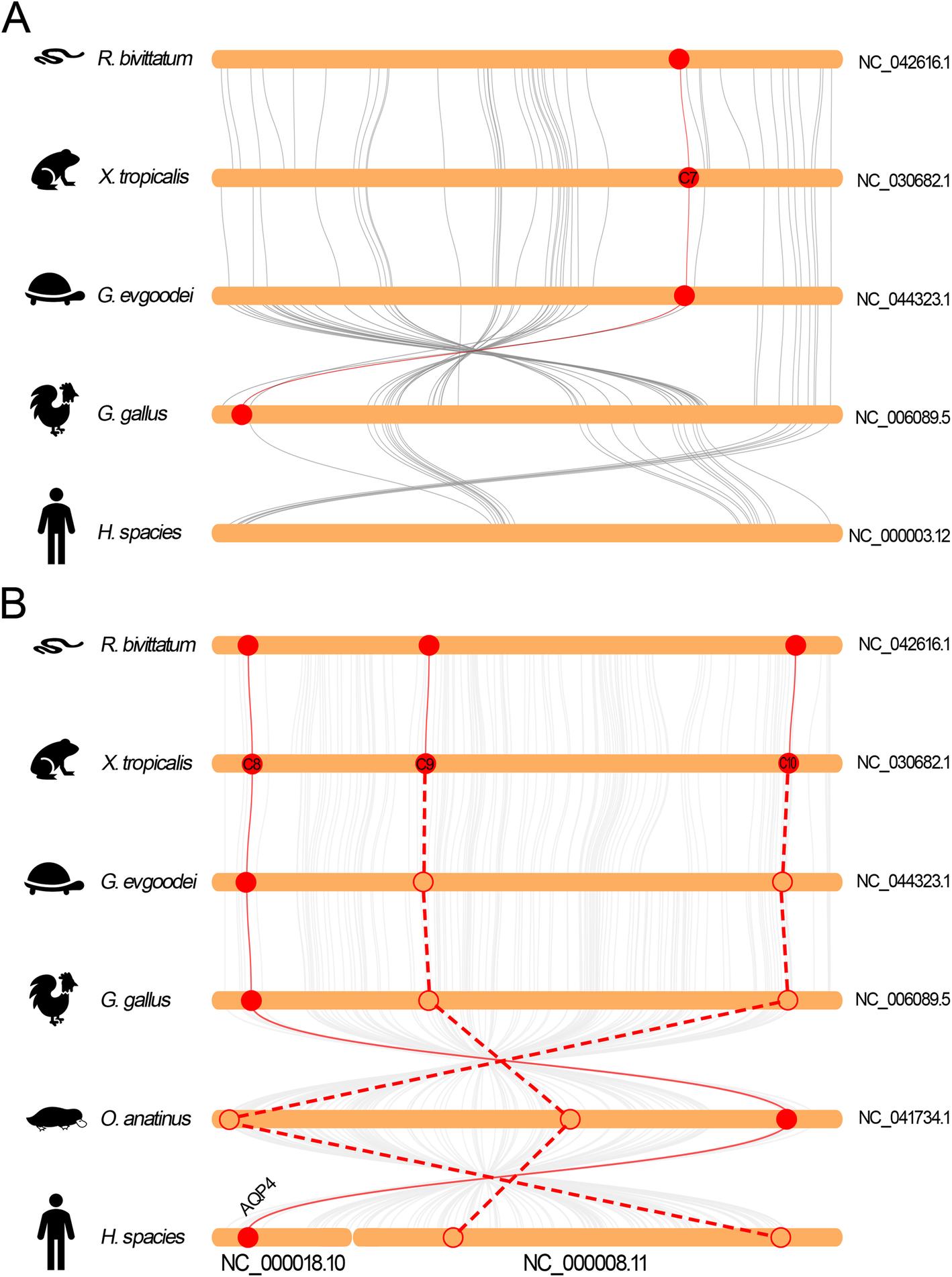 Fig. 7 Collinearity relationship between the orthologs in AQP-8 subfamily in different species. a Collinearity analysis of AQP8.1 orthologs. b Collinearity analysis of AQP8.2 orthologs. The round-corner rectangles filled in yellow represent the conserved regions of the chromosomes in different species. The words behind the round-corner rectangles represent the number of chromosomes. The circles filled in red represent the AQP orthologs appeared in the corresponding chromosome. The hollow circles represent the lost AQP orthologs in the corresponding chromosome. The red curves represent the linkages between the AQP orthologs. The dashed lines represent the imaginary linkages between the lost genes |