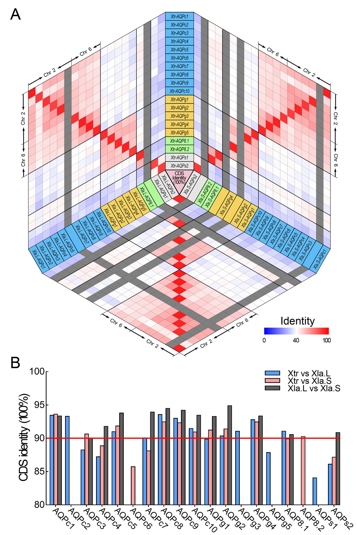 Identities between the CDS encoding AQP genes in the homeologs of X. laevis and X. tropicalis genome. (A) Heatmap of the identities between the sequence of AQP CDS in Xla and Xtr genome. (B) Identity between the ortholog AQP genes in Xla and Xtr genome. |