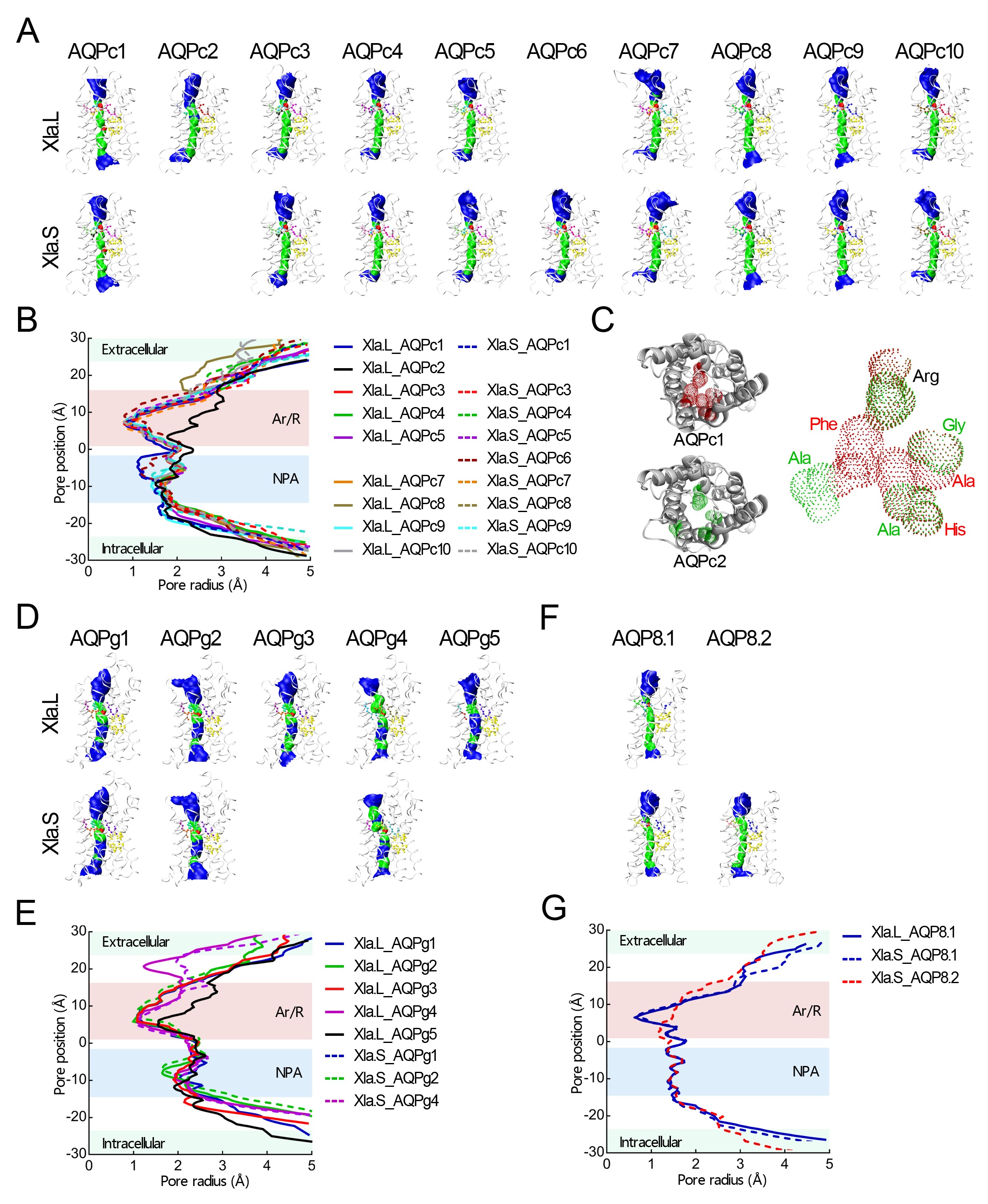 Pore pattern analyses of the AQPs in X. laevis genome. (A) Inner surface of the AQP proteins that clustered into C-AQP subfamily in Xla genome. (B) Individual diameter profiles of the AQP protein channel that clustered into C-AQP subfamily. (C) Comparison of the structure of the Ar/R region between AQPc1 and AQPc2. (D) Inner surface of the AQP proteins that clustered into AQGP subfamily in Xla genome. (E) Individual diameter profiles of the AQP protein channel that clustered into AQGP subfamily. (F) Inner surface of the AQP proteins that clustered into AQP-8 subfamily in Xla genome. (G) Individual diameter profiles of the AQP protein channel that clustered into AQP-8 subfamily. |