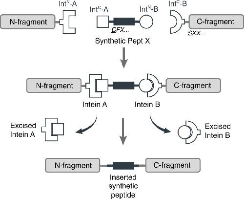 Chemical modification of proteins by insertion of synthetic peptides using tandem protein trans-splicing.