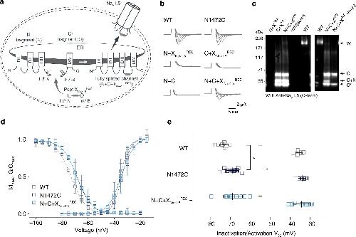 Fig. 2: Insertion of recombinantly expressed peptides into the DIIIâIV linker of NaV1.5. a Schematic presentation of the strategy to reconstruct full-length NaV1.5 from recombinantly expressed N-/C-terminal fragments (N and C) and a recombinantly expressed peptide corresponding to amino acids 1472 to 1502 of the NaV1.5 DIIIâDIV linker (X) in Xenopus laevis oocytes. Inteins A (CfaDnaE) and B (SspDnaBM86) are indicated by square and round symbols, respectively. Note that we cannot exclude the possibility that splicing takes place at a different subcellular location than depicted here. b Representative sodium currents in response to sodium channel activation protocol (see methods; only voltage steps from â50 to +10âmV in 10âmV steps are displayed), demonstrating expression of functional NaV1.5 only in the presence of all three components (Nâ+âCâ+âX), along with WT and N1472C channels (the latter mutation was introduced to create an optimized splice site for intein A. c Immunoblots verifying the presence of fully spliced NaV1.5 only when all three components (Nâ+âCâ+âX) were co-expressed (using antibody against NaV1.5 C-terminus). NaV1.5 band was not detected when one component was missing (left blot) or when non-splicing mutation (Nâ+âCâ+âX mut.) was introduced to prevent splicing (right blot; see Supplementary Fig. 2). Black arrows indicate band positions of the respective constructs (Actual MW of constructs: WT, 227âkDa; C-construct, 79âkDa; Câ+âX, 65âkDa; C-terminal cleavage product, C*, 58âkDa). Note that X and XREC refer to XNav1.5REC in this panel. d Steady-state inactivation and conductanceâvoltage (GâV) relationships for functional constructs tested. e Comparison of values for half-maximal (in)activation (V50) (values are displayed as meanâ+â/â SD; WT, nâ=â12; N1472C, nâ=â14; Nâ+âCâ+âXNav1.5REC, nâ=â16). Significant differences were determined by one-way ANOVA with a Tukey post-hoc test. *pâ<â0.03 (WT vs. N1472C, pâ=â0.014; WT vs. Nâ+âCâ+âXNav1.5REC, pâ=â0.012). Source data are provided as a Source data file. |