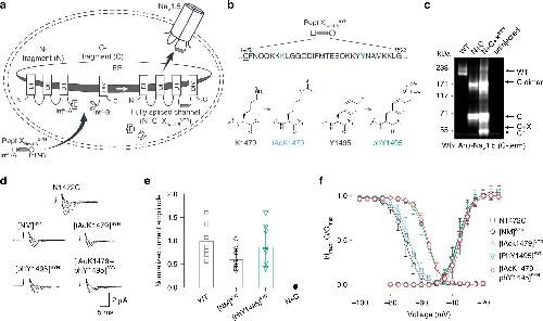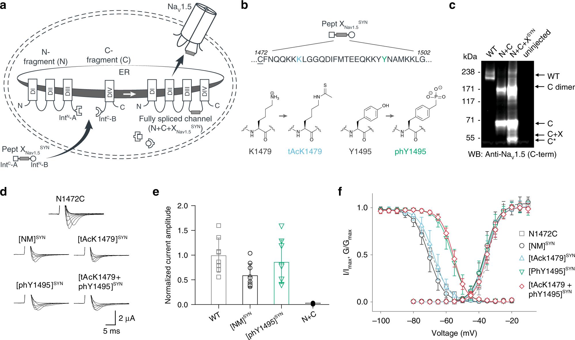 Fig. 3: Insertion of synthetic peptides into NaV1.5. a Schematic of strategy to reconstruct full-length NaV1.5 from recombinantly expressed N-/C-terminal fragments (N and C) and a synthetic peptide (XNav1.5SYN) in Xenopus laevis oocytes. Inteins A (CfaDnaE) and B (SspDnaBM86) indicated by square and round symbols, respectively. Note: we cannot exclude that splicing takes place at a different subcellular location than depicted. b Peptide XNav1.5SYN sequence corresponding to amino acids replaced in the NaV1.5 DIIIâDIV linker and chemical structures of native amino acids and PTM mimics (tAcK/phY) incorporated via chemical synthesis of peptide XNav1.5SYN. The N1472C (underlined) mutation was introduced to optimize splicing (Supplementary Fig. 1). c Immunoblot verifying the presence of fully spliced NaV1.5 only when peptide XNav1.5SYN was co-injected with N and C. Black arrows indicate band positions of the respective constructs (Actual MW of constructs: WT, 227âkDa; C, 79âkDa; Câ+âX, 65âkDa; C-terminal cleavage product, C*, 58âkDa). Band at ~150âkDa is possibly a dimer or aggregate of C. d Representative sodium currents (see Methods; only voltage steps from â50 to +10âmV in 10âmV steps are displayed), demonstrating expression of functional NaV1.5 when Xenopus laevis oocytes expressing N and C constructs were injected with synthetic peptides containing non-modifiable side chains in positions 1479 and 1495 (K1479R and Y1495F, NM), tAcK1479 or phY1495 or both PTM mimics together. e Average current amplitudes recorded at â35âmV from oocytes expressing N and C constructs and injected with synthetic peptide variant NM or phY1495 depicted as a bar plot (meanâ+â/â SD; WT, nâ=â8; NM, nâ=â9; phY, nâ=â8; Nâ+âC, nâ=â6). Currents normalized to mean currents measured from oocytes expressing the full-length WT construct. To ensure adequate control of voltage clamp, [Na+] in the extracellular recording solution was reduced (see Supplementary Fig. 3 for details). f Steady-state inactivation and conductanceâvoltage (GâV) relationships for PTM-modified/non-modified constructs (values displayed as meanâ+â/â SD; N1472C, nâ=â15; NM, nâ=â10; tAcK1479, nâ=â21; phY1495, nâ=â19; tAcK1479â+âphY1495, nâ=â14). Source data are provided as a Source data file. |