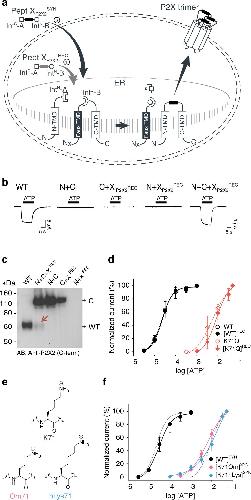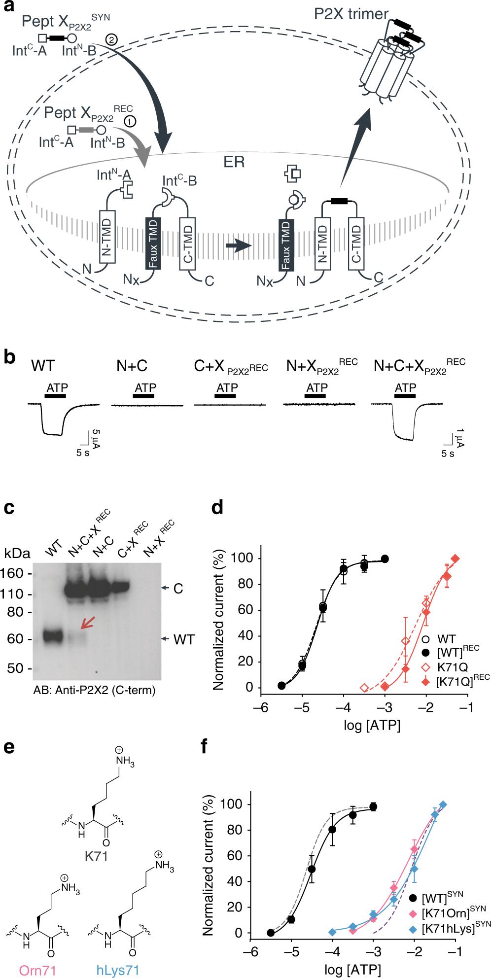 Fig. 6: Insertion of recombinant and synthetic peptides into the P2X2R extracellular domain. a Schematic presentation of the strategy to reconstruct full-length P2X2Rs from recombinantly expressed N-/C-terminal fragments (N and C) and a recombinant (strategy 1, Pept XP2X2REC) or synthetic peptide (strategy 2, Pept XP2X2SYN) into the P2X2R extracellular domain in Xenopus laevis oocytes. Note that a faux transmembrane helix (faux TMD) was engineered into the C-terminal fragment to maintain its native membrane topology (see also Supplementary Fig. 9). Inteins A (CfaDnaE) and B (SspDnaBM86) indicated by square and round symbols, respectively. Peptide X was designed to include a C-terminal ER-targeting KDEL signal sequence, which is excised during the splicing process. However, we cannot exclude the possibility that splicing takes place at a different subcellular location than depicted here. b Representative current traces obtained by application of 30âµM ATP, verifying functional expression only when all three components were recombinantly co-expressed (strategy 1 in a). c Immunoblot of surface-purified proteins. Black arrows on the right indicate band positions of the respective constructs (actual MW of constructs: WT, 53âkDa; C-construct, 97âkDa). Red arrow indicates the band of the spliced full-length receptor. d ATP concentration-response curves (CRCs) for P2X2 WT (black) and K71Q (red) reconstituted from the three co-expressed constructs. Dashed lines represent the CRCs for the respective full-length proteins. e Structures of inserted side chains at position 71 (Lys, Orn, hLys) incorporated via synthetic peptide X (strategy 2 in a). f ATP CRCs indicate successful incorporation of synthetic WT peptide XP2X2SYN (black) with wild-type like ATP sensitivity, while synthetic peptides with Orn (pink) or hLys (blue) resulted in a decrease in ATP sensitivity. Dashed lines indicate ATP CRCs for spliced P2X2R WT (gray) or K71Q (purple) obtained with peptide XP2X2REC. Values in d and f are displayed as meanâ+â/â SD; WT, nâ=â5; [WT]REC, nâ=â8; K71Q, nâ=â7; [K71Q]REC, nâ=â9; [WT]SYN, nâ=â7; [K71Orn]SYN, nâ=â9; [K71hLys]SYN, nâ=â5). Source data are provided as a Source data file. |