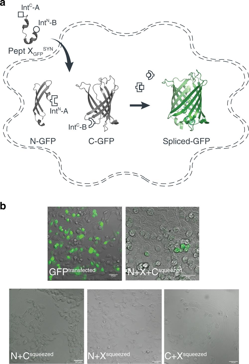 Fig. 5: Insertion of synthetic peptides into GFP. a Schematic of strategy applied to reconstitute GFP from recombinantly expressed N-/C-terminal fragments and a synthetic peptide XGFPSYN in HEK293 cells. b Overlay of bright-field and fluorescence images taken of HEK293 cells transfected with only WT GFP, or N and C fragments and squeezed in the presence or absence of peptide XGFPSYN. Scale bars: 50 µm. |