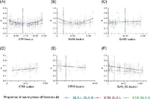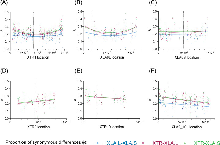 Fig 2. Relationship patterns between proportion of synonymous substitutions (k) and chromosome location.Representative figures displaying different relationship patterns for each genome pair combination (XTR-XLA.L in red, XTR-XLA.S in green, and XLA.L-XLA.S in blue). (A) Chromosome 1 (e.g. XTR1) showed a common non-linear relationship between k and location. This higher k in distal parts of the chromosome was also seen in chromosomes 2 to 7, irrespective of the genome used for location in the x-axis (S1 Fig). (B, C) Chromosome 8 showed contrasting patterns based on the genome used for location reference: (B) XTR8 (S1 Fig) and XLA8L showed higher k in the distal part of chromosome, while (C) XLA8S had no marked relationship between k and location, likely due to intra-chromosomal rearrangements [6]. (D) In XTR9, k increased distally with location, while (E) it decreased in XTR10; (F) in the homoeologous XLA9_10, k decreased with location. Centromere positions are indicated by dotted vertical line and estimated based on position of frog centromeric repeat 1 (Fcr1) [21] or centromeric markers from X. tropicalis [22]. Full results are shown in S1 Fig.