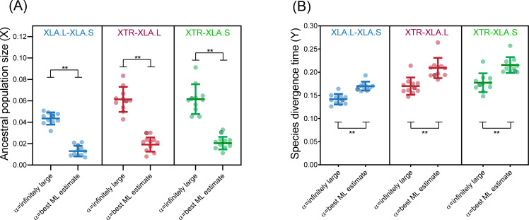 Fig 3. Best maximum likelihood estimates of X = 4Nμ and Y = 2μt.Estimates were used to calculate ancestral population size and species divergence time, respectively (in ancestor of XLA-XTR or XLA.S-XLA.L). These estimates were significantly different compared to those using infinitely large α (**p < 0.0001, t-test). Line bars represent mean ± s.d.; each point represents each chromosome, with genome-wide results indicated by dark circles.