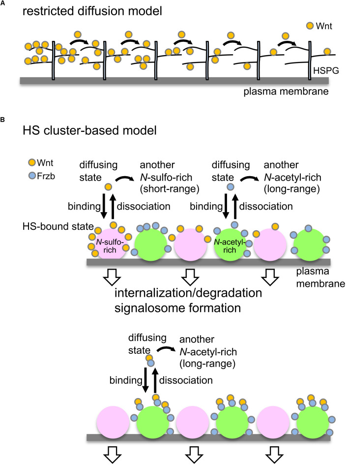 FIGURE 2. Models to control Wnt signaling and dispersal by HSPGs. (A) Restricted diffusion model. Based on genetic studies in Drosophila, it has been proposed that HSPGs mediate Wnt delivery by a restricted-diffusion mechanism, in which Wnt ligands are transported in a âbucket brigadeâ manner by repeated association and dissociation with HSPGs on cell membranes (Yan and Lin, 2009). (B) Model to explain Wnt signaling and delivery by clustering of HSPGs. Wnt8 preferentially binds to N-sulfo-rich HS clusters and Frzb binds to N-acetyl-rich clusters (upper; Mii et al., 2017). Accumulation of Wnt8 on N-sulfo-rich HS clusters leads to signalosome formation and internalization of Wnt8, which may contribute to degradation of Wnt8. When Frzb is abundant (lower), Wnt8-Frzb complexes bind to N-acetyl-rich HS clusters, which may reduce degradation of Wnt8 (Mii et al., 2017). Given that these two clusters are not distributed uniformly on the cell surface, it seems unlikely that Wnt ligands are transported in a âbucket brigadeâ manner between these clusters. Since N-sulfo-rich HS clusters are frequently internalized, this cluster appears to shorten the distribution range of Wnt8 (Mii and Taira, 2009). On the other hand, N-acetyl-rich HS clusters tend to remain on the cell surface, resulting in long-range distributions of Frzb as well as Wnt8-Frzb complexes (Mii and Taira, 2009). One possible model is that the balance of Wnt interactions between N-sulfo-rich HS clusters and N-acetyl-rich HS clusters may regulate Wnt signaling range in tissues.