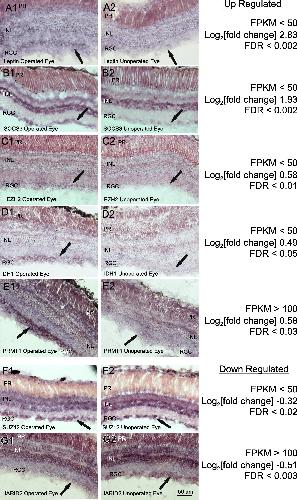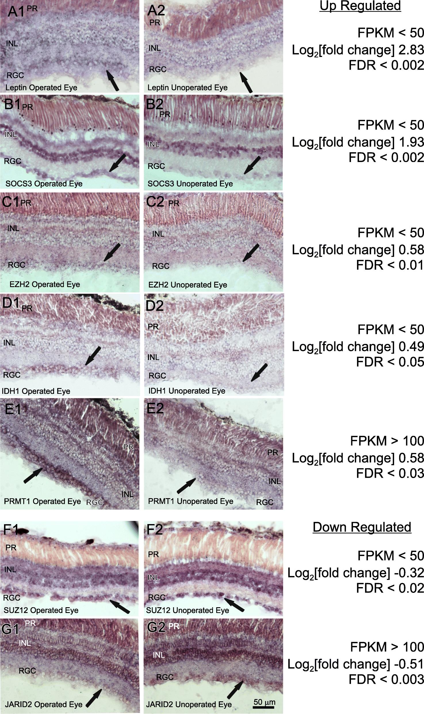 Fig. 7. Cellular localization of select DESR genes by in situ hybridization of retina at the peak phase of regenerative axon outgrowth after optic nerve injury. Genes are as indicated in their respective panels and represent a range of fold-change values (0.03â<â|log2(fold change)|â<â3), and FDRs (0.002â0.05), as well as relatively low (FPKM <â50) and high (FPKM >â100) levels of expression. Examples of up-regulated (a â e) and down-regulated (f, g) genes are included. Column 1 (left), operated eye; column 2 (right), contralateral unoperated eye from the same animal and processed on the same slide as that of its adjacent column. Arrows indicate cells of the retinal ganglion cell layer, which comprises the neurons that regenerate an axon. Abbreviations: RGC, retinal ganglion cells; INL, inner nuclear layer; PR, photoreceptors. Scale bar in G2 applies to all panels |