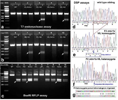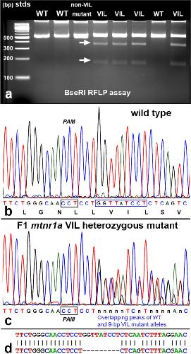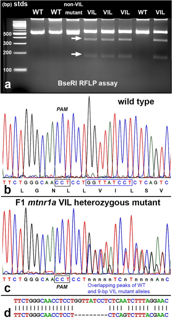 Figure 2. Identification of heterozygous F1 animals with CRISPR/Cas9 indel mutations of the mtnr1a gene. (a) Representative RFLP analysis shows that PCR products of mtnr1a VIL heterozygotes display two predicted cleavage bands (arrows), whereas WT and non-VIL mutant DNA is not cleaved. The creation of a BseRI site by the VIL deletion is illustrated in Supplementary Fig. S3. (b) Direct PCR Sanger sequencing chromatogram of F1 WT progeny display prominent peaks for all bases in the T2 sgRNA target area. The T2 PAM sequence (CCT) is boxed in black, and the downstream 9-bp sequence of the mtnr1a VIL deletion mutation is boxed in blue. The corresponding amino acid sequence is shown below the nucleotide codon sequence. (c) In an F1 tadpole heterozygous for the mtnr1a 9-bp (VIL) deletion, the trace decomposes (i.e., mixed base calls) at the predicted target site 4-bp downstream of the T2 PAM site, and continues to the end of the trace, as expected for a heterozygous indel mutation. The decomposed sequence represents the overlapping peaks of the mtnr1a WT and VIL alleles. (d) Partial view of alignments from Poly Peak Parser (https://yosttools.genetics.utah.edu/PolyPeakParser/) output revealing the heterozygous 9-bp mtnr1a VIL deletion mutation. The WT allele is the top line and the mutant allele is the bottom line. |