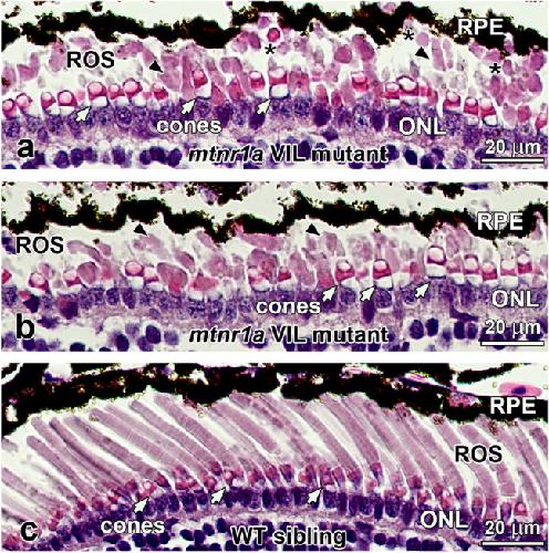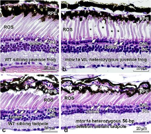 Figure 7. Heterozygous mtnr1a VIL mutant young adult (juvenile) frogs display normal rods and cones. (a) WT juvenile frogs display normal rods (ROS) and cones. (b) F1 mtnr1a VIL heterozygous mutant juvenile sibling frogs display healthy-looking rods and cones, although the ROS density appears to be lower than in WT (asterisks). Mtnr1a 56-bp deletion mutant tadpoles do not display rod dystrophy. (c) Four-month-old WT tadpole retinas and (d) F1 mtnr1a heterozygous 56-bp deletion (potential knockout) siblings exhibit healthy-appearing rods (ROS) and cones (white arrows). RPE retinal pigment epithelium, ROS rod outer segments, ONL outer nuclear layer, INL inner nuclear layer. Magnification barsâ=â20 µm. |