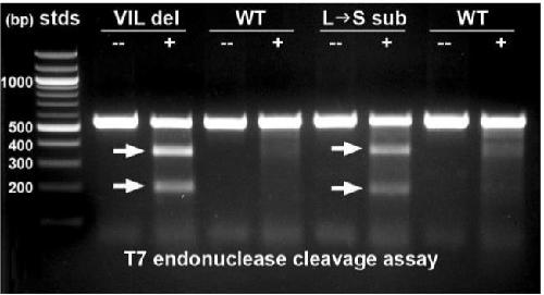 Figure S2. Cas9 in vitro cleavage assay with sgRNAs. Genomic DNA from a Nigerian strain wild type (WT) X. tropicalis adult was used as the PCR template. DNA PCR products were incubated with sgRNA and Cas9 protein, and then separated on an agarose gel. PCR products of WT gDNA were cleaved into the predicted sizes of DNA fragments (white arrows) when incubated in vitro with Cas9 protein (T1, T2, and T3 lanes). The T1 and T2 target sites are in close proximity to each other on exon 2, so the Cas9 cleavage could be detected using the same PCR primer pairs (T12). The T3 target site was in exon 3, so a different set of PCR primers was used to amplify that region. PCR products that were not incubated with the Cas9 enzyme (--) displayed no cleavage bands. |