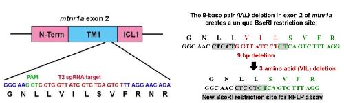 Figure S8. A novel restriction fragment length polymorphism (RFLP) assay uniquely identifies VIL mutants. Left panel: Schematic representation of exon 2 of the mtnr1a gene, with the TM-1 domain flanked by the amino-terminus (N-Term) and first intracellular loop (ICL-1) domains. The nucleotide sequence targeted by the T2 sgRNA at the lower area of the panel is indicated in red, with the concomitant amino acid sequence below. The protospacer-adjacent motif (PAM) sequence, which directs Cas9 targeting, is indicated in green. Some flanking nucleotide sequence is indicated in blue. Right panel: The VIL deletion merges the upstream CTCCT sequence with the downstream CT sequence to create a unique BseRI restriction site. |