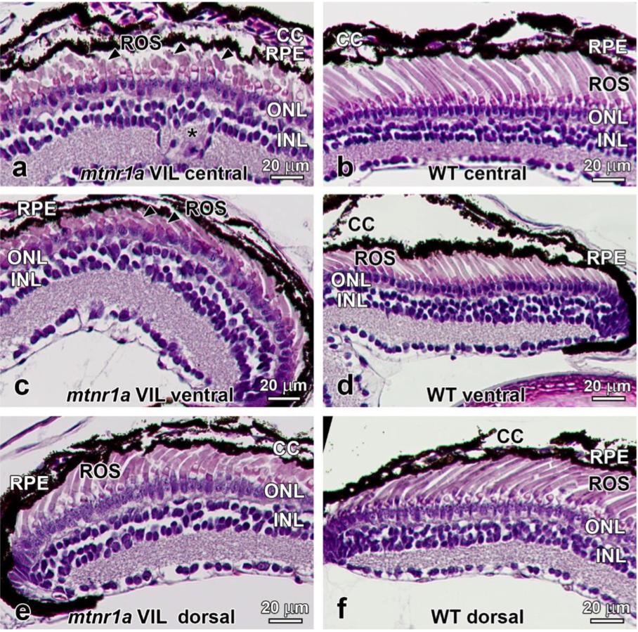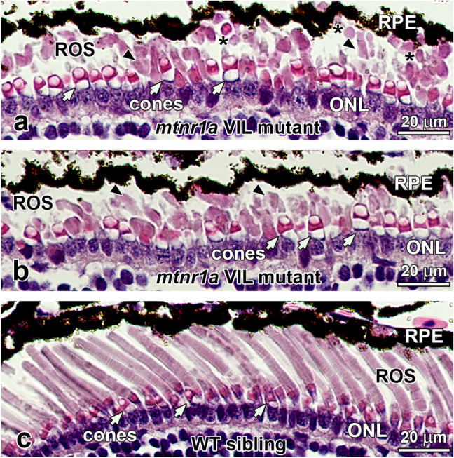 Figure 5. Rods are dystrophic in stage 54â56 (4-month-old) F2 heterozygous but not homozygous mtnr1a VIL mutant tadpoles (nâ=â5). F2 heterozygous and homozygous tadpoles were generated by crossing two F1 VIL mutant heterozygotes. (a) WT siblings of F2 mutants exhibit healthy-appearing rod and cone photoreceptors. (b) Central retinas of VIL mutant heterozygous tadpoles display ROS dystrophy and abnormal distribution of RPE cells, whereas cones appear relatively normal (white arrows). (c) Retinas of homozygous VIL mutant siblings display morphologies similar to WT siblings. (d) Quantitative measurements of rod dystrophy in X. tropicalis retinas show that rod outer segment (ROS) length is diminished significantly by 24% in VIL heterozygous 4-month-old tadpoles, compared to WT when analyzed by an unpaired two-tailed t-test (*; pâ=â0.0267, nâ=â3). The 15% decline in ROS length in VIL homozygous tadpoles compared to WT was statistically insignificant (pâ=â0.0867, nâ=â3). No significant differences in rod (i.e., ROS) or cone abundance were observed among the three genotype groups. Measurements were made of digital images of groups of 4-month-old tadpoles represented in aâc. Error bars indicate standard error of the mean. RPE retinal pigment epithelium, ROS rod outer segments, ONL outer nuclear layer, INL inner nuclear layer, cone inner segments; white arrows. Magnification barsâ=â20 µm. |