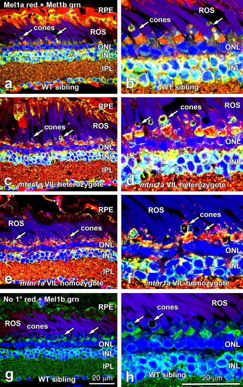 Figure 6. Retinas of heterozygous and homozygous mtnr1a VIL mutant tadpoles display Mel1a protein expression at intensities similar to WT siblings. Double-label confocal immunohistochemistry (IHC) of (a,b) WT, (c,d) F2 VIL heterozygous, and (e,f) F2 VIL homozygous tadpole head paraffin sections was performed with antibodies to X. laevis Mel1a (red label) and Mel1b (green label) melatonin receptors. Panels on the right are higher magnifications of areas in panels on the left side of the figure. Mel1a receptor fluorescent signal intensity and location appears to be similar in animals of all three genotypes. The Mel1a receptor is expressed in RPE, rod and cone photoreceptors (arrows), and inner retinal neurons. The Mel1a and Mel1b receptors display an expression pattern different from each other, although there are areas in which the red and green labels merge as a yellow label, suggestive of co-expression and/or very close proximity to each other. (g,h) WT retina sections processed for IHC with Mel1b antibodies, but without Mel1a antibodies (No 1° red) display specific immunofluorescence for Mel1b (green), but not for Mel1a (red). RPE retinal pigment epithelium, ROS rod outer segments, ONL outer nuclear layer, INL inner nuclear layer, IPL inner plexiform layer, arrows; rod photoreceptor inner segments. Magnification barsâ=â20 µm. |