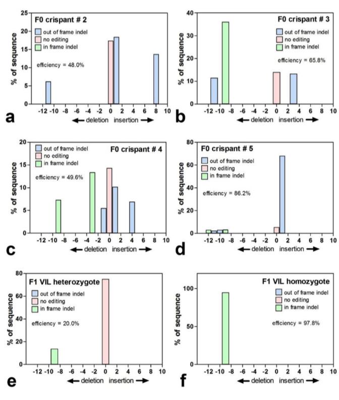 Figure S5. Comparison of the editing efficiency of the mtnr1a T2 sgRNA in F0 mutant animals. Trace decomposition yields the spectrum of indel size and frequency occurring within a 0 to 12- bp indel size range. (a) The F0 crispant #2, which is the male founder of all of the F1 progeny described in this study, does not display a 9-bp deletion in this TIDE analysis of PCR products from gDNA extracted from a pair of web clips. (b-d) F0 sibling crispants #3-5 all display a 9-bp deletion at various frequencies, with crispant #3 having the highest frequency. (e) For comparison, PCR of web clip gDNA from an F1 heterozygous VIL mutant frog displays the expected indels only at 0 and -9-bp. (f) A sibling F1 homozygous VIL mutant frog displays a -9-bp indel only, as anticipated. TIDE analysis was performed using http://tide.nki.nl [81]. |