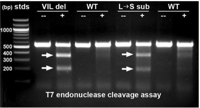 Figure S7. Identification of heterozygous F1 animals with CRISPR/Cas9 indel mutations of the mtnr1a gene. Representative T7E1 assay of two heterozygous mutant mtnr1a F1 and two F1 WT sibling tadpoles. PCR products amplified from gDNA extracted from F1 progeny were denatured to separate the cDNA strands, then re-annealed slowly to promote formation of mismatched WT/mutant double-stranded cDNA. Mismatched sites of re-annealed WT and mutant DNA strands in heterozygous tadpoles are cleaved by T7E1 (+), resulting in two cleavage products (arrows) in a tadpole with the 9-bp (non-frameshift VIL) mtnr1a deletion, and for comparison, in another tadpole with a 3-bp substitution (predicted amino acid change is LâS; see supplementary figure S7). The DNA of normal homozygous (WT) progeny is not cleaved by T7E1 (+), and none of the samples are cleaved in the absence of the enzyme (--). |